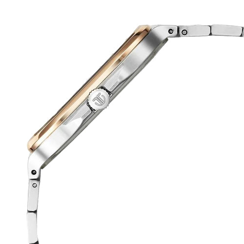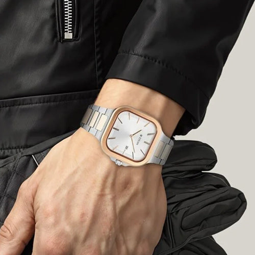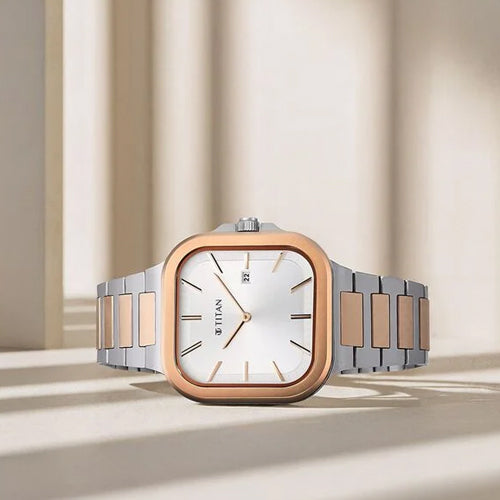 Elevate your look with this men's analog watch from the Classique Slim Square collection by Titan. Encased in a 41 mm case, the silver square dial features plain 2-hand functionality and quartz movement on the watch. The stainless steel bracelet comes in a two-tone hue that further elevates the look of the watch. Besides, it is water resistant up to 50 m and is completed with a push button clasp to ensure a secure fit on the wrist.
