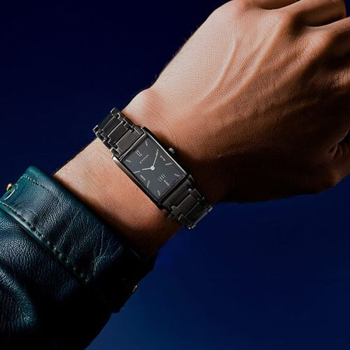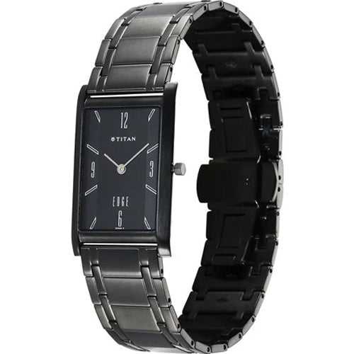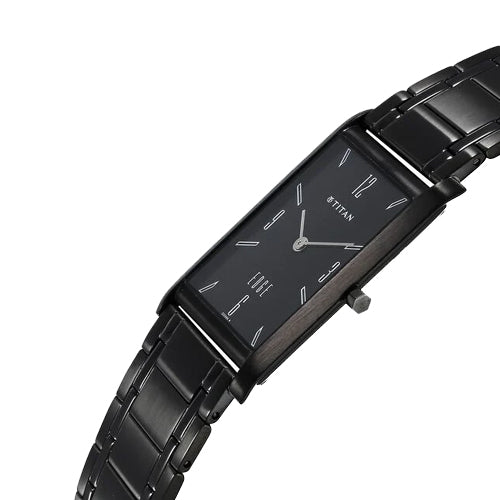 A distinguished timepiece from the Edge by Titan. Powered by the T9081 in-house calibre movement, this watch exemplifies precision and craftsmanship. Constructed from high-quality stainless steel, the watch embodies durability and elegance, making it suitable for both casual and formal occasions. This watch delivers a sleek, minimalist aesthetic. It features a case thickness of just 3.6 mm, ensuring a lightweight feel on the wrist. The sapphire crystal glass is scratch-resistant, providing clarity and protection for the black rectangle dial. The dial is beautifully crafted with a matte finish, showcasing plain white hands that ensure easy readability against the dark background. With black solid link bracelet and a water resistance of up to 3 ATM, this watch is versatile enough to withstand splashes and brief immersion in water.