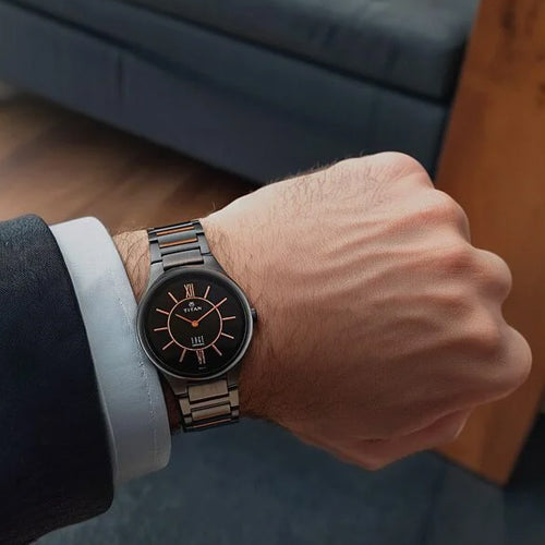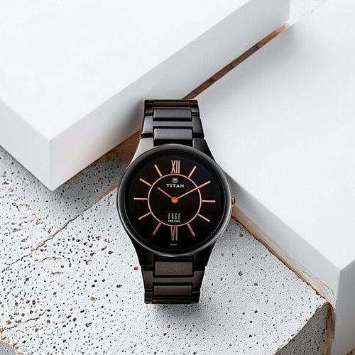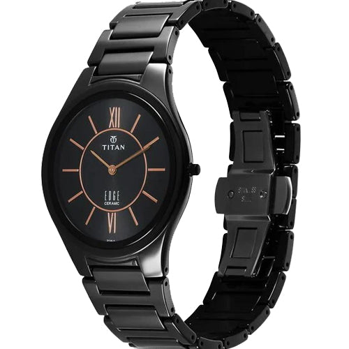 The Titan Edge Ceramic is a sophisticated and sleek timepiece designed for those who value minimalistic elegance. It features an in-house T9081 calibre quartz movement, ensuring reliable and precise timekeeping.Crafted with a ceramic case and strap, this watch is lightweight, durable, and resistant to scratches. The case measures 40.5 mm in width with an ultra-slim thickness of 4.4 mm, making it one of the slimmest ceramic watches available. The black ceramic strap is secured with a butterfly clasp, offering a seamless and comfortable fit. The watch is fitted with a sapphire crystal, known for its scratch resistance and clarity, protecting the rich black dial. The dial design is minimalist, adorned with elegant rose gold-toned hands that add a touch of luxury. It is water-resistant up to 3 ATM (30 meters), making it suitable for everyday wear. Ideal for formal settings, this watch combines style and sophistication, perfect for those looking to make a subtle yet refined statement