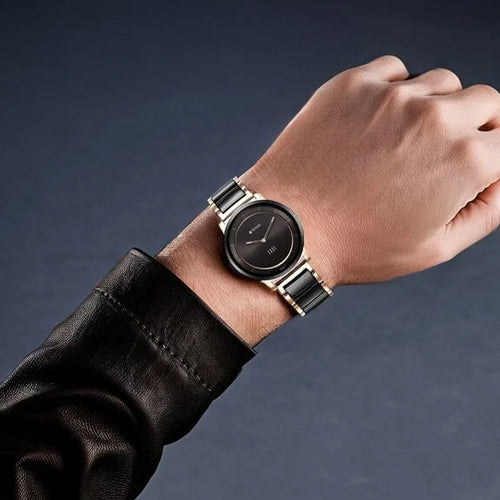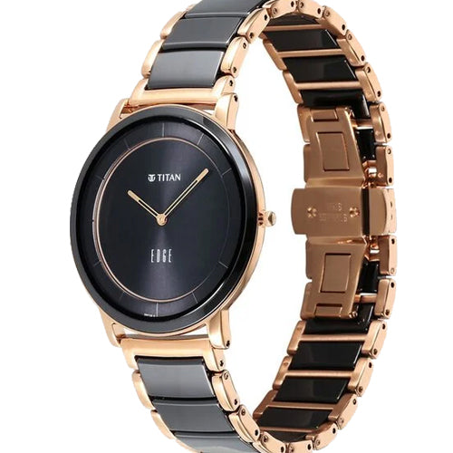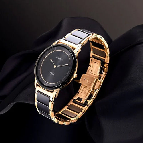 Introducing the Titan Edge Fusion, a watch that embodies sophistication and advanced craftsmanship. This exquisite timepiece is part of the Edge Fusion collection, showcasing a harmonious blend of contemporary design and innovative technology. At the heart of this watch lies the T9081 in-house calibre movement, ensuring precise timekeeping. Crafted from high-grade ceramic and stainless steel, this watch is not only durable but also lightweight, making it comfortable for everyday wear. The design is aimed at those who appreciate elegance without compromising on performance, making it ideal for both professional settings and casual outings. The strap is a striking combination of black steel and ceramic, featuring a secure butterfly clasp for ease of use. With a case thickness of just 4.65 mm, it offers a sleek profile that enhances its overall aesthetic. The watch is protected by sapphire glass, renowned for its scratch resistance and clarity. The dial is a classic black, adorned with polished hour markers and hands, contributing to its sophisticated allure. The dial finish is smooth, providing a clean and unobstructed view of time, while the hands are designed for optimal legibility. This model is water-resistant up to 30 meters, making it suitable for everyday activities. With its elegant design and high functionality, the Titan Edge Fusion is perfect for those who seek a stylish accessory that can seamlessly transition from day to night. Whether you're attending a business meeting or enjoying a night out, this watch is sure to make a statement.