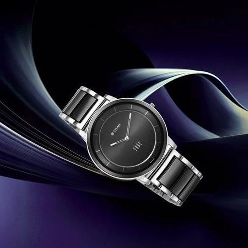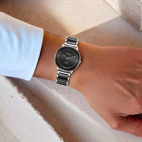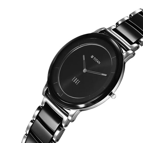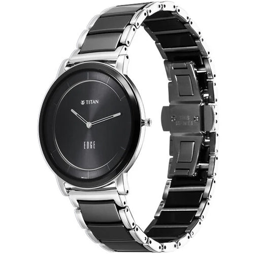 Introducing the Titan Edge Fusion, a stunning timepiece from Edge by Titan, known for its sleek and sophisticated designs. This watch is powered by the T9081 in-house calibre movement, ensuring precise timekeeping and reliability. Crafted with an amalgamation of high-grade ceramic and stainless steel, the case not only offers a modern aesthetic but also provides exceptional durability. The watch is designed for formal occasions, making it the perfect accessory for both professional and elegant settings. Its case thickness is a mere 4.65 mm, which enhances its minimalist charm and comfort on the wrist. The watch features a black dial that is both stylish and easy to read. It is protected by a flat sapphire glass, ensuring resistance to scratches while maintaining a clear view of the dial. The dial is accentuated by silver-toned hour and minute hands, creating a striking contrast against the black background. With a water resistance rating of 30 meters, this timepiece can withstand minor splashes and rain, making it suitable for everyday wear. The watch's dimensions include a case diameter of 41 mm, making it a versatile size for various wrist sizes. Equipped with a butterfly clasp with pusher, the strap not only adds to the elegance of the watch but also ensures a secure fit. This watch is ideal for individuals who appreciate a blend of modern design and functionality, making it suitable for both casual and formal events.