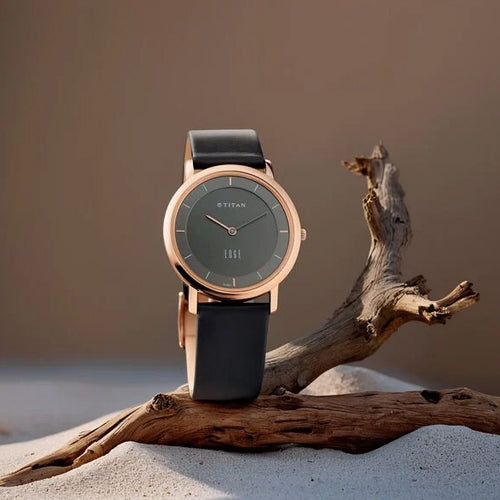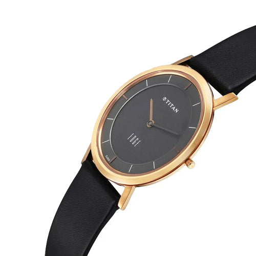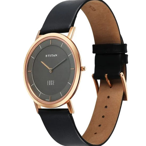 A slim watch from Edge by Titan watches, featuring the precision of the T9081 in-house calibre movement. Crafted from high-grade stainless steel, this watch is designed for sophisticated use. The striking black dial is protected by durable mineral glass, and the sleek golden case has a thickness of 3.6 mm, ensuring a refined profile. It boasts a water resistance of 3 ATM, making it suitable for everyday wear. The stylish black leather strap adds to its overall appeal, making it perfect for both formal and casual occasions.