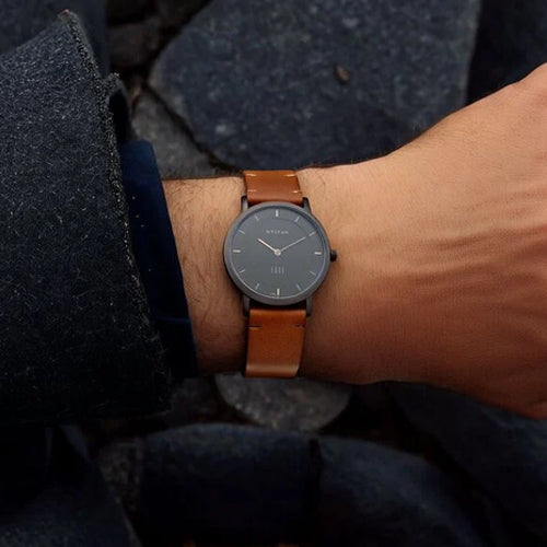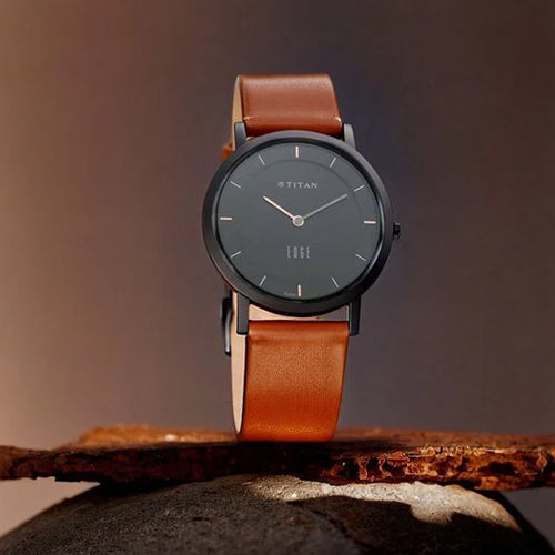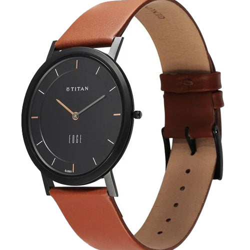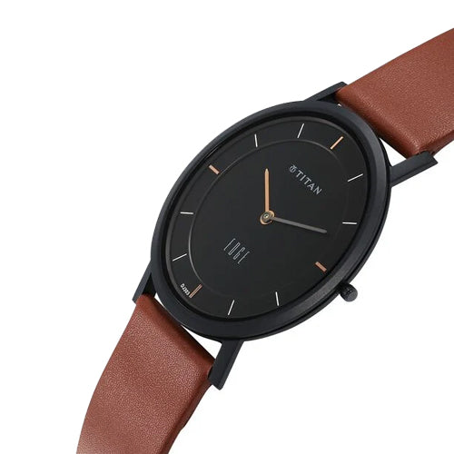 An elegant timepiece from Edge by Titan, designed for those who appreciate understated luxury. This watch features the precise T9081 in-house calibre movement, ensuring reliable timekeeping. The case is crafted from high-quality stainless steel, providing both durability and a sleek aesthetic. With a slim profile of only 3.6 mm in thickness, it fits comfortably on the wrist, making it perfect for everyday wear. The watch is protected by durable sapphire glass, ensuring that the dial remains clear and scratch-free over time. The sophisticated black dial is finished with a beautiful finish, highlighting the silver-tone hour markers and hands for excellent visibility. Water-resistant up to 50 meters, this watch is suitable for daily activities and light splashes. Paired with a stylish tan brown leather strap, this watch effortlessly transitions from business meetings to casual outings, making it a versatile accessory for any occasion.