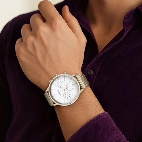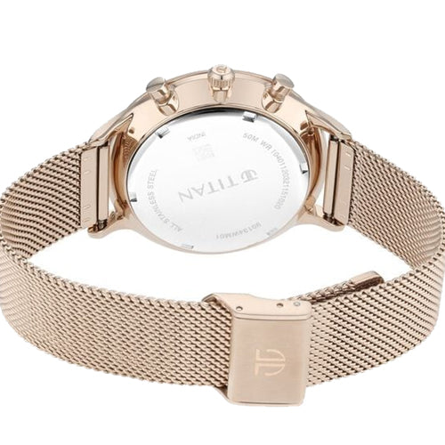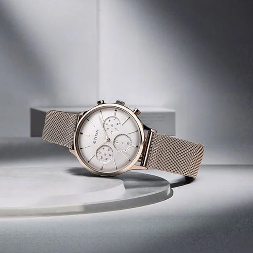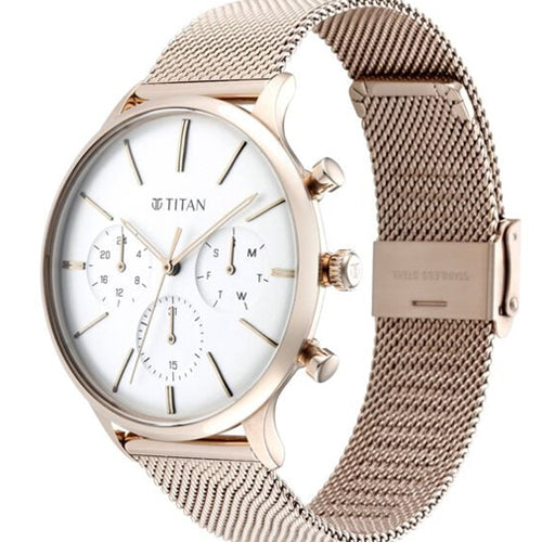 Give a boost to your style by wearing this men's analog watch from the Light Leathers collection by Titan. Its round-shaped white dial is nestled in a case of 42mm diameter. The stainless steel bracelet of this watch exudes a rose gold hue for an attractive look. Its hook buckle clasp ensures a secured fit around the wrist. The inclusion of multifunction quartz movement adds to its features.