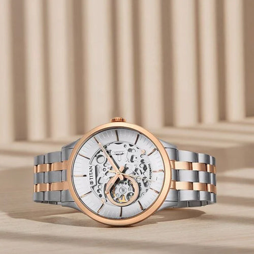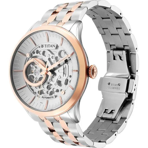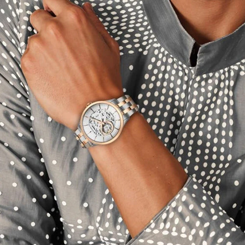This timepiece features a high precision mechanical movement, ensuring accurate, battery-free timekeeping with exceptional reliability. The dual toned stainless steel strap provides a sleek, modern look while offering durability and comfort. The silver open worked skeletal dial reveals the intricate mechanics of the watch, showcasing its craftsmanship. A circular highlight on the movement draws attention to the delicate inner workings, adding a unique visual appeal. Perfect for both formal and casual looks, pair it with a sharp suit for a sophisticated appearance, or wear it with a smart-casual outfit like a tailored blazer and chinos for a polished yet relaxed style. This versatile watch elevates any outfit with its blend of precision and modern design.