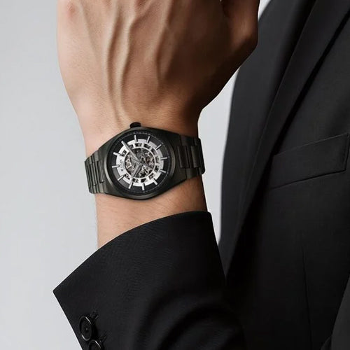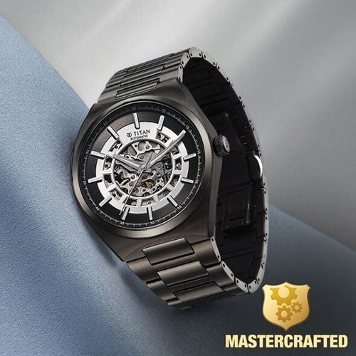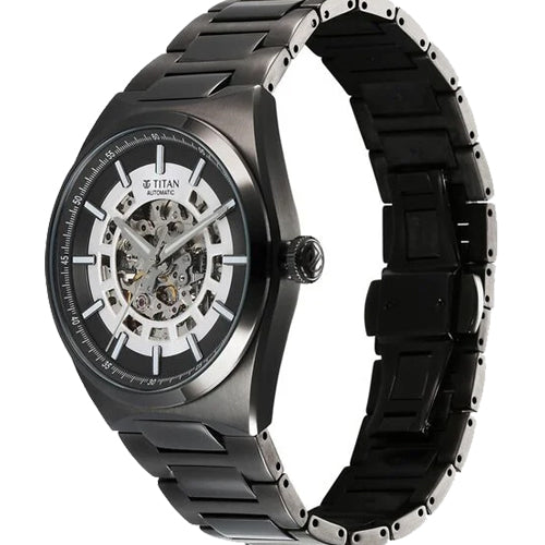 Navigate time with precision and style with the Titan Nexus Skeletal Automatic. Inspired by a ship's helm, its open-worked dial symbolizes movement and progress, offering a captivating view of the intricate 21-jewel automatic movement with a 42-hour reserve. Available in striking gunmetal monochromatic finish, its integrated bracelet ensures a seamless, contemporary fit. Luminous hands, applied indices, and a minute ring enhance legibility, making this timepiece a refined companion for those who chart their own course.