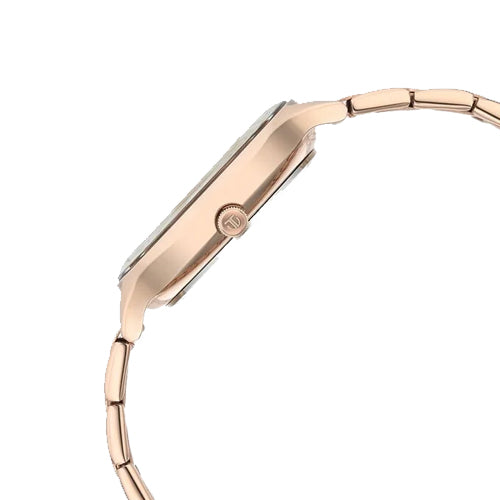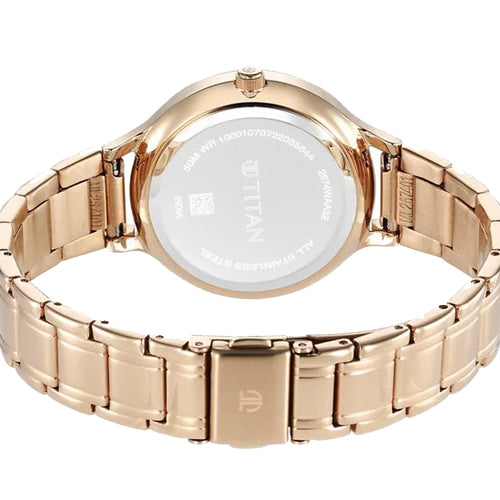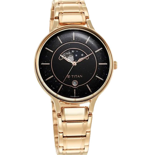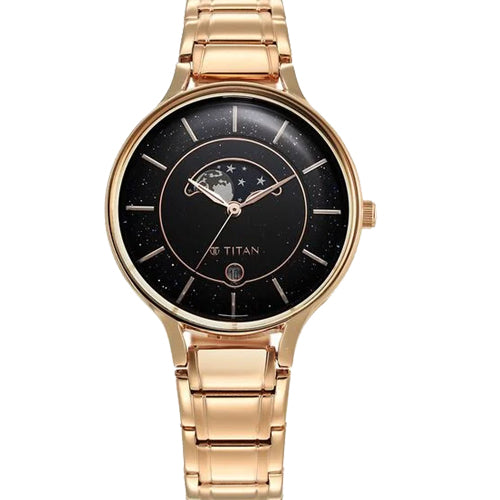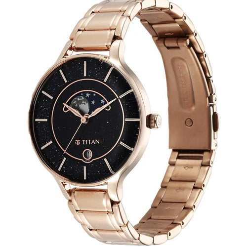 Dapper your wrist with this women's analog watch from the Premium Workwear collection by Titan. Its round-shaped black dial is protected in a case of 35 mm diameter. The stainless steel bracelet of this watch exudes a rose gold hue for an eye-catching look. Its push-button clasp ensures a secured fit around your wrist. The inclusion of plain 3-hand quartz movement adds to its features.