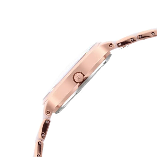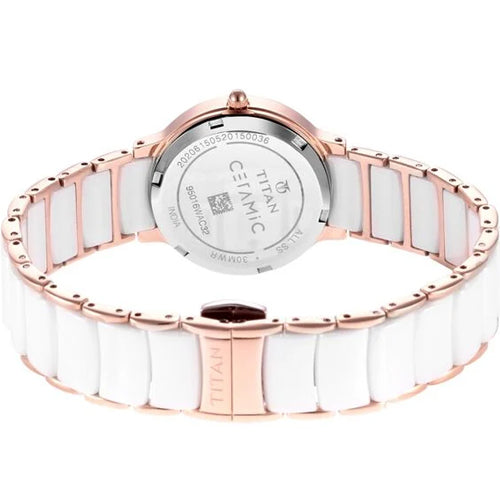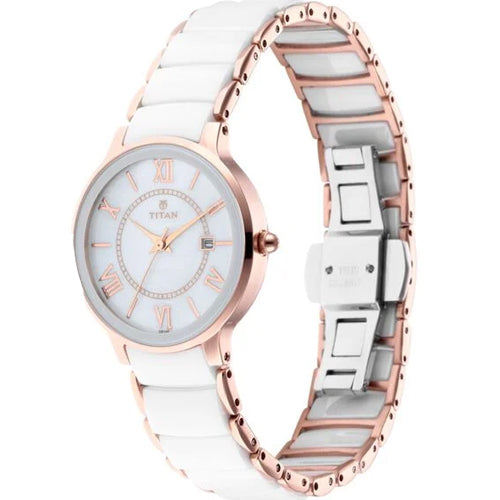 Embrace sophistication with this round mother of pearl dial analog watch for women. The rose gold and white strap, secured with a push button clasp, adds a touch of elegance. The combination of Roman numerals and slanted lines on the dial enhances readability. Pair it with a chic evening gown for a timeless and graceful look.