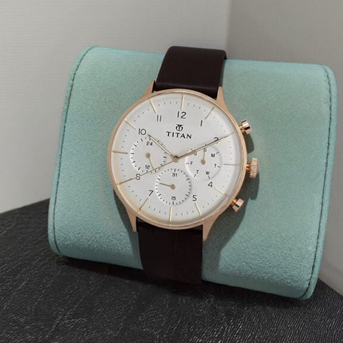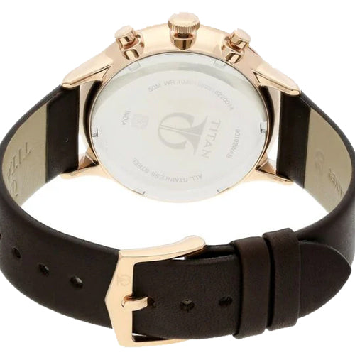 Elevate your style with bold sophistication embodied in this white dial multifunction watch from the Titan Classique collection. Encased in a round stainless steel case, the polished white dial harmonizes perfectly with the brown leather strap, secured with a buckle lock for a tailored fit. This 5 ATM water-resistant watch with scratch-proof mineral glass is a timeless companion for formal occasions. Pair it with a sharp suit or a tailored dress for a refined look that speaks volumes.