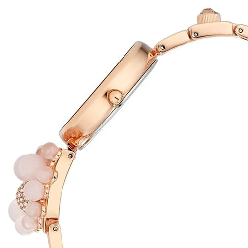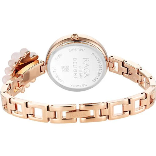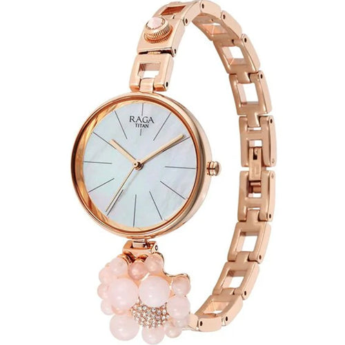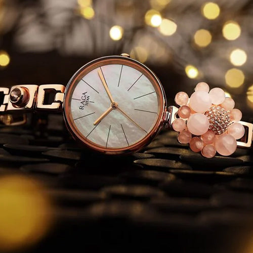 Get a suave look wearing this women's analog watch from the Raga Delight collection by Titan. Its round-shaped mother-of-pearl dial is protected in a case of 36 mm diameter. The stainless steel bracelet of this watch exudes a rose gold hue for an eye-catching look. Its jewelry clasp ensures a secured fit around your wrist. The inclusion of plain 3-hand quartz movement adds to its features.