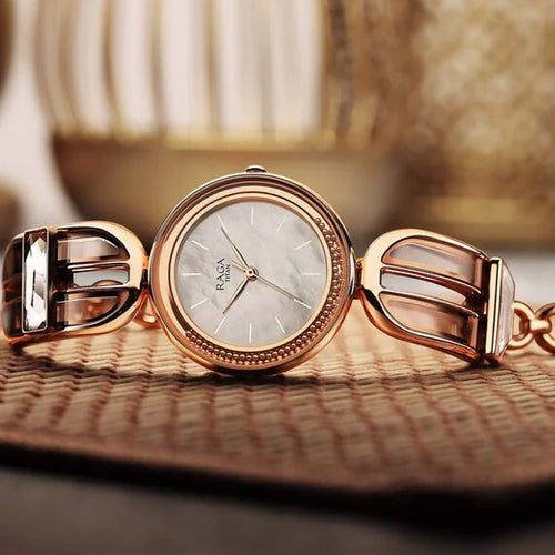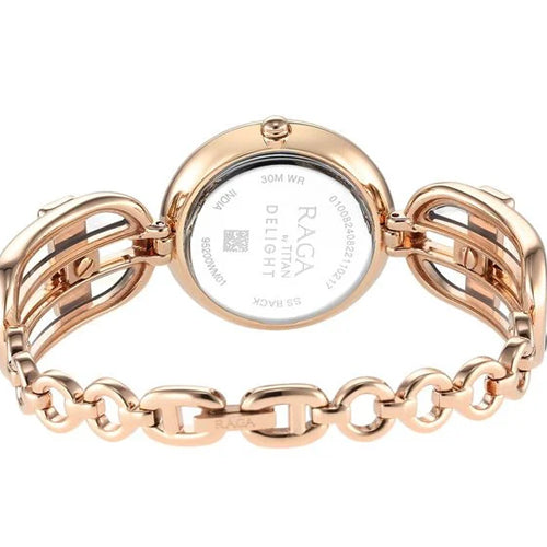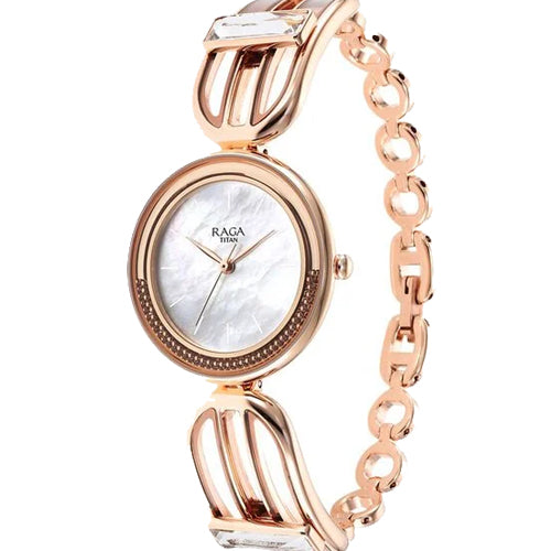Elevate your style with the Titan Raga Delight, a stunning timepiece designed for the modern woman who embraces grace and glamour. This exquisite watch features a delicate round-shaped case paired with a dreamy mother-of-pearl dial, giving it an ethereal charm. The rose gold-toned bracelet flaunts intricate openwork and crystal accents, making it more than just a watch-it’s jewelry on your wrist. Perfect for festive occasions or elegant evenings, this watch is a timeless expression of beauty, femininity, and refinement.