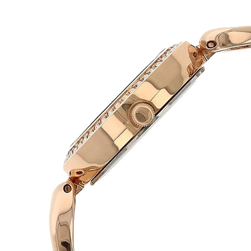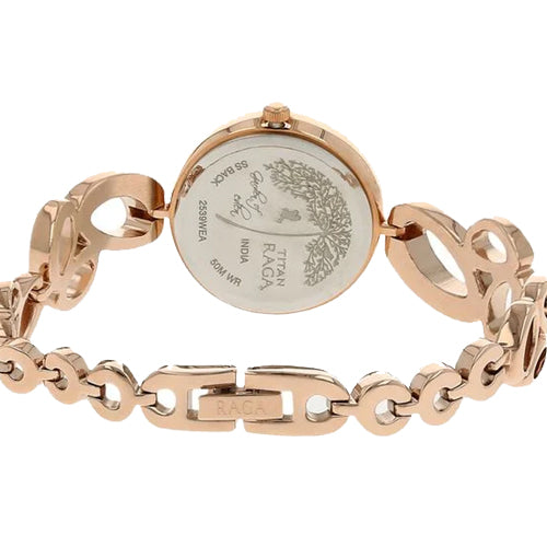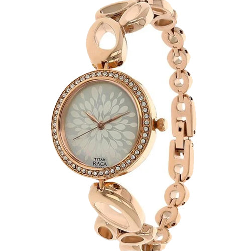 Embrace grace and sophistication with this analog watch for women. The round mother of pearl dial, encased in rose gold, adorned with crystal stones, is a symbol of timeless beauty. The metal strap with a jewelry clasp adds a touch of glamour. Style it with a flowy evening gown for a refined and enchanting look.