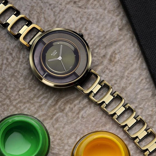 Add smartness to your personality by wearing this women's analog watch from the Raga Moments of Joy collection by Titan. Operated by a quartz movement and safeguarded by a mineral glass, the olive green round dial is encased in a 35 mm case. It features plain three hands and a crown for time adjustment. The metal strap comes in a forest green hue that further elevates the look of the timepiece. Moreover, it is fitted with a jewellery clasp to ensure a secure fit on the wrist.