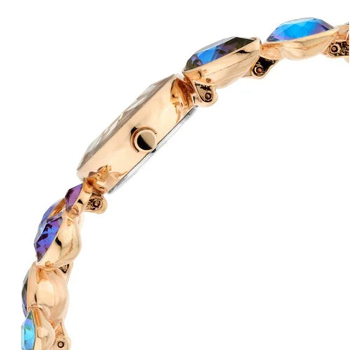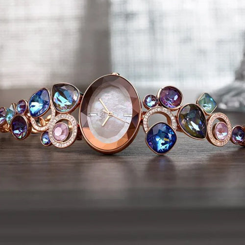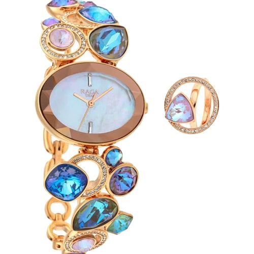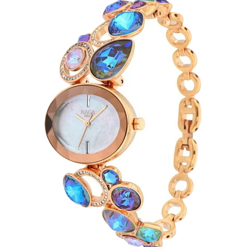 Unveil timeless beauty with the Titan Raga Moments Of Joy watch, a radiant celebration of feminine charm and craftsmanship. The piece features a serene Mother of Pearl oval dial, housed in a warm rose gold-toned case. Its highlight is the opulent rose gold metal strap, adorned with shimmering multi-hued crystals - blue, aqua, violet arranged like scattered gemstones, giving the watch the elegance of fine jewellery. Complemented by a coordinating designer ring, this watch set is perfect for weddings, parties, or festive gifting. It combines fashion and function with Its reliable quartz movement and enchanting design.