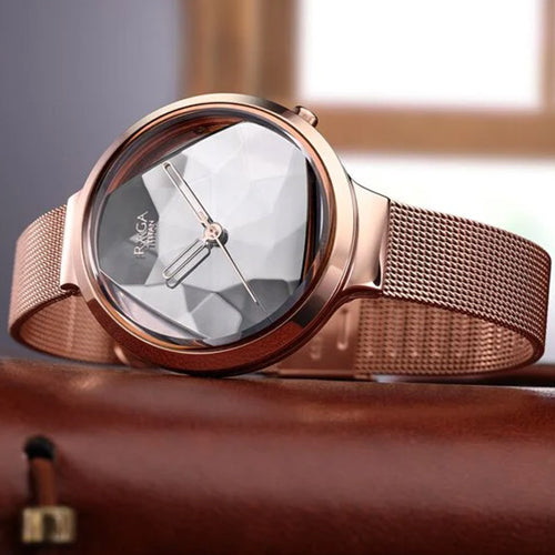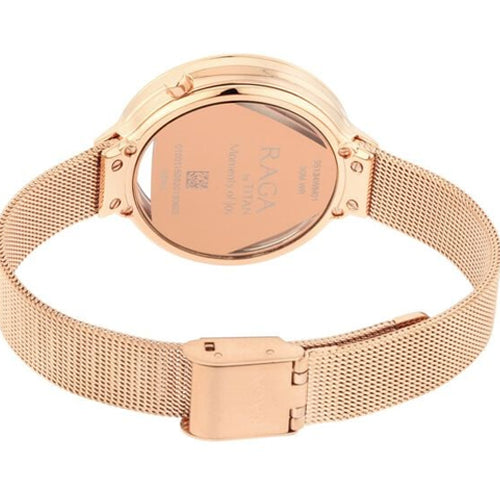 Give your timepiece collection a completion with this women's analog watch from the Raga Moments of Joy collection by Titan. Functional on a quartz movement and protected by a mineral glass, the silver round dial is housed in a 35 mm case. It displays plain three hands and a crown for time adjustment. The metal strap flaunts a rose gold hue that accentuates the look of the watch. Besides, it is completed with a hook buckle clasp to ensure a secure fit on the wrist.