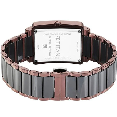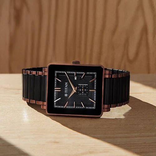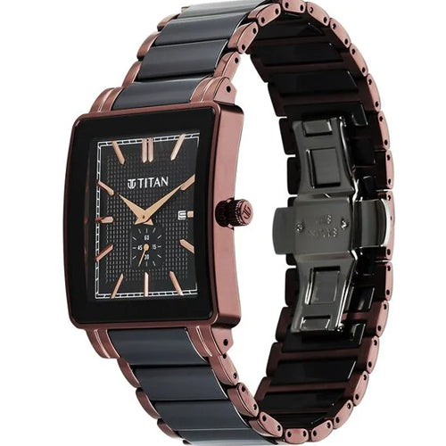 The Titan Regalia Shaped Ceramic watch is an exceptional piece, designed for special occasions where elegance is key, like weddings and formal gatherings. Its bold shaped case is paired with a striking black dial, featuring a sophisticated press-patterned surface and a seconds sub-dial for added refinement. The IP brown stainless steel and black ceramic strap form a unique combination, with the rich brown tone offering a warm contrast to the deep black, creating a modern yet timeless appeal. With a date function and luxurious finish, this watch blends style and practicality, ensuring you make a memorable impression at your most important events.