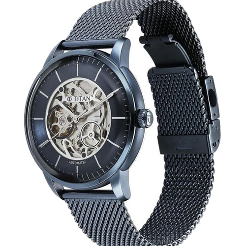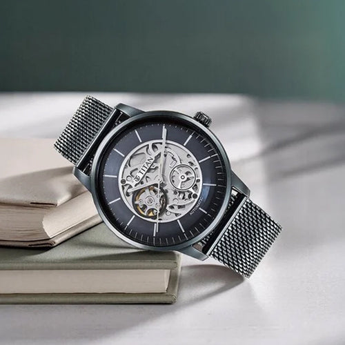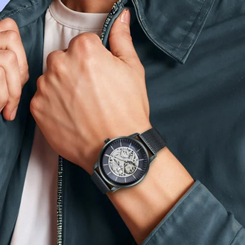 This timepiece features a fashionable mesh strap, exhibition skeletal design, and a clean openworked dial, combining modern style with intricate craftsmanship. The mesh strap offers a sleek, breathable fit, while the skeletal design showcases the watch's inner mechanics. The openworked dial enhances visibility and highlights the watch's precision. Perfect for both casual and formal looks, pair it with a well-fitted suit for a sophisticated touch, or wear it with smart-casual attire like a tailored blazer and chinos for a polished yet relaxed look. The versatile design elevates any outfit, making it a perfect accessory for any occasion.