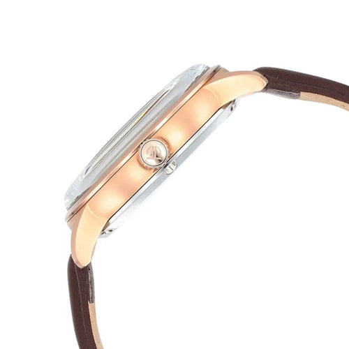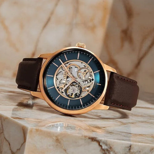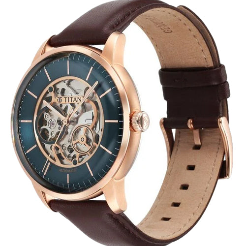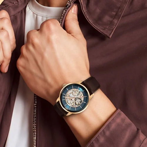 Make your presence felt in this classy automatic timepiece. A round dial with a sleek bezel, plain 3 hands, a skeleton window, and stick indices make this an enigmatic piece. The watch also features water resistance up to 50 meters and a sturdy leather bracelet strap with a tang buckle closure that ensures a secure fit.