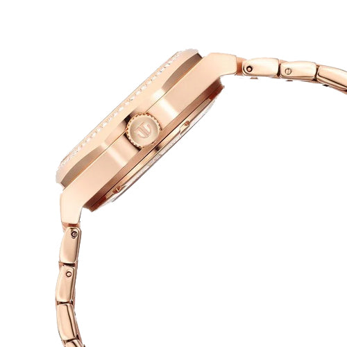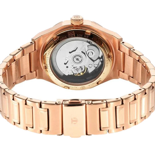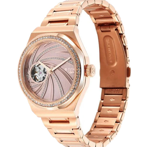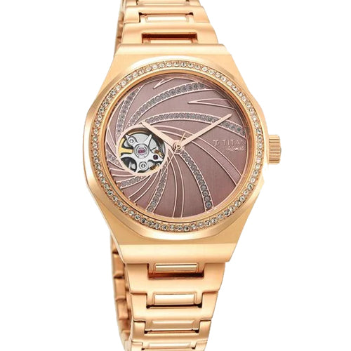 Bold artistry meets technical brilliance in this Titan Automatics watch. The captivating rose gold dial is styled with a swirl-textured pattern, highlighted by crystal detailing that draws the eye toward the open-heart window revealing the mechanical movement beneath. Paired with a polished rose gold stainless steel strap and crystal-studded bezel, this watch embodies elegance with a modern edge. Its automatic mechanism not only adds character but also eliminates the need for a battery - a perfect fusion of sophistication and self-sufficiency.