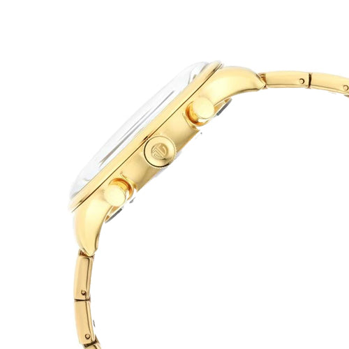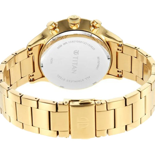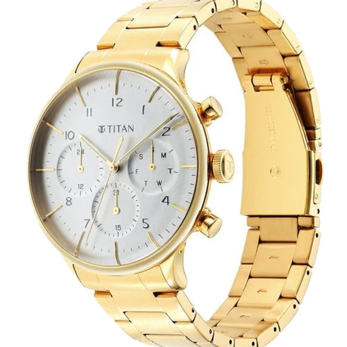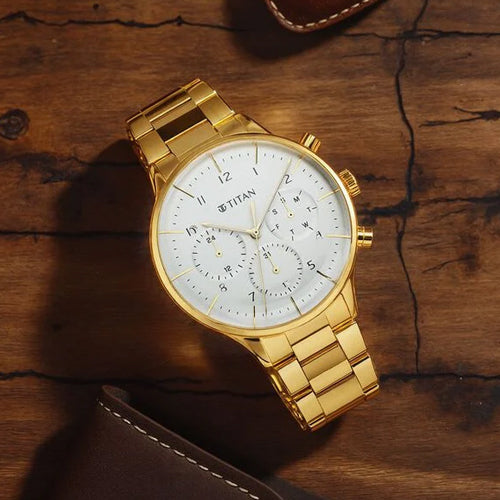 Reveal your unparalleled design preferences with this analog watch from TITAN. Encased in a 42 case, the white round-shaped dial, features a multifunction functionality, quartz movement and a crown for time adjustment. The stainless steel bracelet comes in a gold hue that further elevates the look of the watch. Besides, it has a water resistance of up to 30 m and is completed with a push button clasp to ensure a secure fit on the wrist.