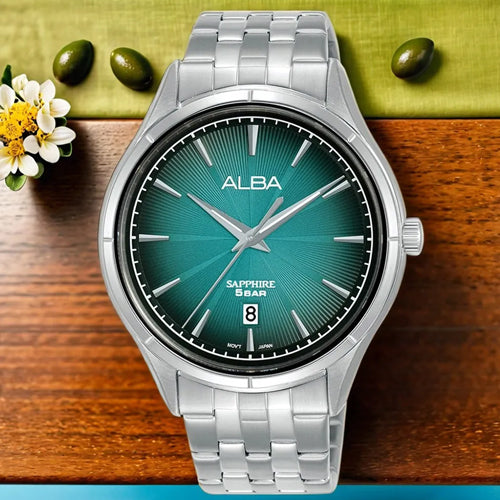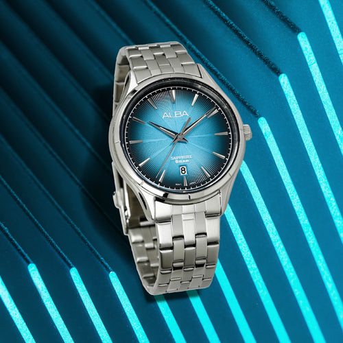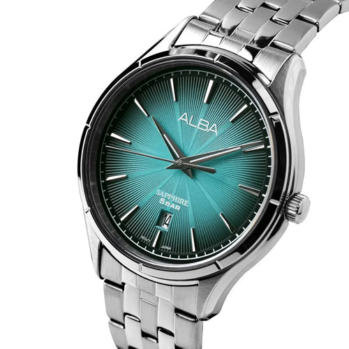 The ALBA Marine Blue Patterned Dial Quartz Men's Watch (AS9T71X1) offers a distinctive design that captures the spirit of the sea. Its rich marine blue patterned dial creates an impression of depth and movement, reminiscent of ocean waves. Accentuated by elegant hour markers and hands, the dial ensures both style and functionality. Encased in durable stainless steel, this timepiece combines modern aesthetics with the precision of a quartz movement, offering reliable timekeeping. Perfect for those who appreciate a touch of adventure in their accessories, the ALBA Marine Blue Patterned Dial Quartz Men's Watch is an ideal choice for any occasion.