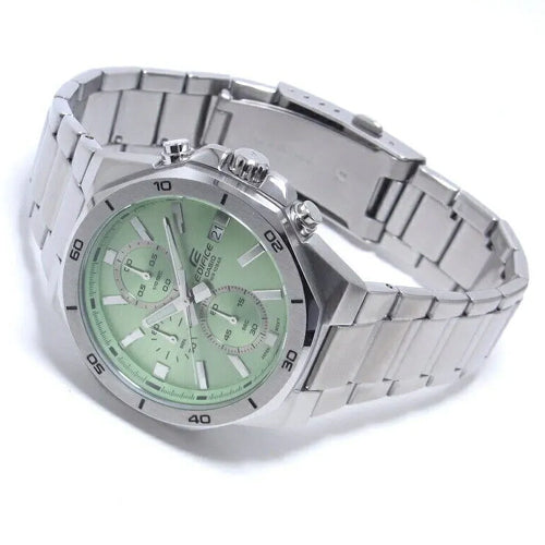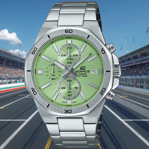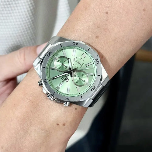 Slip on a classic with a colorful twist, and enjoy the simple sophistication of a sporty chronograph with 10-bar water resistance. The flat front surface of the octagonal bezel is polished to a hairline finish and paired with mirror-finish sides, creating a handsome textural contrast — all dressed up with a dial in a soft, yet vibrant color to give your wrist a touch of extra style.