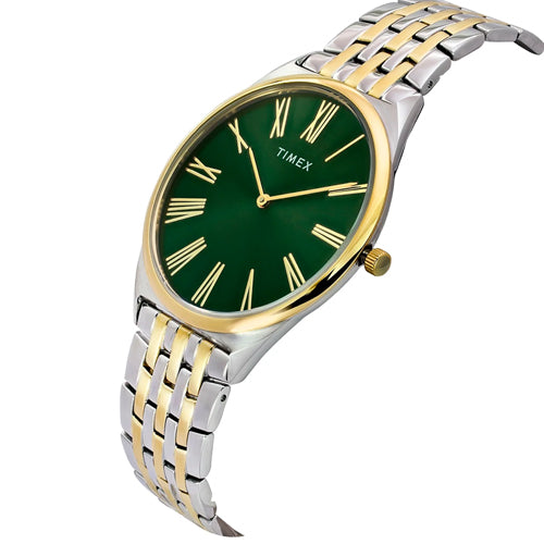 Experience timeless craftsmanship with the TIMEX Watch for Men Analog, a true classic among water resistant watches for man Analog. Designed with a bold 40mm Green dial and a stylish Two Tone Stainless Steel this Men's watches model combines modern edge with vintage charm. Built for everyday wear, its Stainless Steel case ensures durability, while the 30 m water resistance makes it suitable for daily splashes and unexpected weather. The Analog watch for man runs on reliable Quartz movement, offering precise timekeeping that suits both casual outings and formal occasions. This watch for man ideal for those who appreciate a minimalist look in a classic watch for man making it a perfect choice for office, travel, or daily commutes. Whether you're shopping a watch for man, a formal watch for man, or a timeless wrist watch for Men, this model checks all the right boxes. It also makes a thoughtful gift, combining elegance with practicality.Its Comes With minimal maintenance and a one-year warranty (limited to manufacturing defects).
