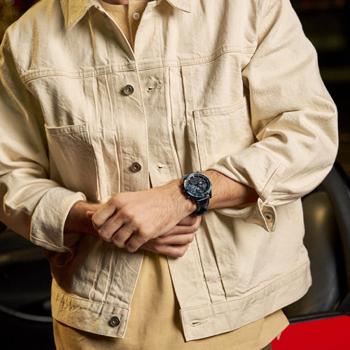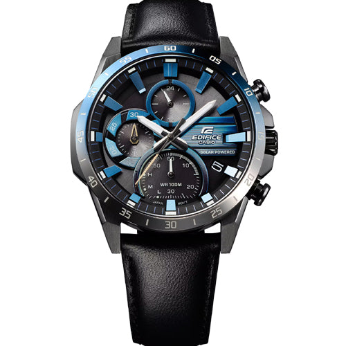 Love the feeling of cruising along darkened roadways? The glow of headlights and streetlamps cutting the deep blue of the night sky? Then you’ll love this EDIFICE timepiece designed to capture the mood of nighttime driving, made just right for the auto enthusiast. The thrill of driving city streets late at night is captured in the brilliantly gradated color of the bezel—the night sky reproduced above in blue ion plating and the glow of lights below in the silver color of titanium carbide processing. This two-color gradation process renders a stunning bezel with an exquisite shine and is echoed on the dial’s components, as well. This beauty also stores enough solar power for five months of normal use when fully charged.