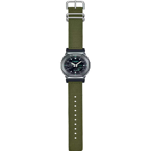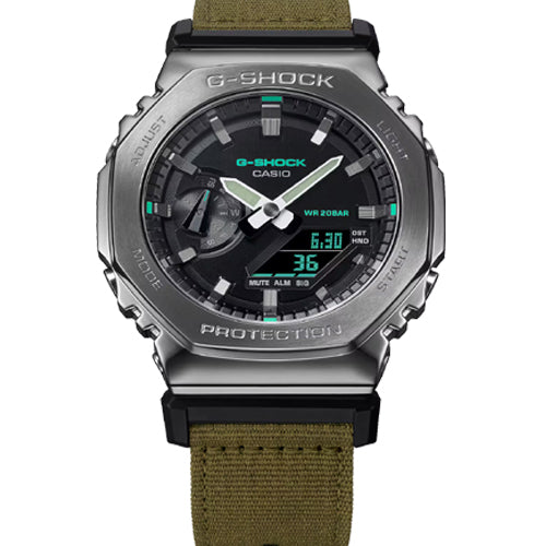 Add a utilitarian statement to your style with a G-SHOCK from the Utility Metal collection.These innovative watches take the iconic octagonal form and metal-clad design of the GM-2100 line and pair it with a casual fabric band in an utilitarian color that goes with any outfit. The striking contrast of metal and fabric results in an rugged style that is all about toughness and casual sophistication.