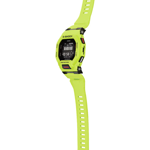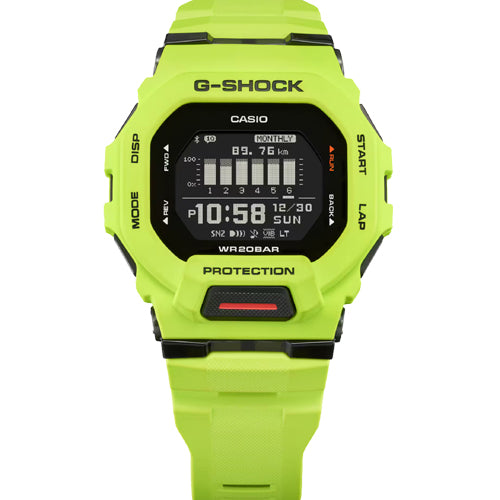Say hello to some serious passion for sports with the G-SQUAD line of G-SHOCK watches. These models feature a square face design in colors chosen to calibrate with the most extreme workouts. Get in on the thinnest G-SQUAD yet. Side slits in the bezel allow the color of the inner case to peek through, highlighting just how slim this watch is. The light button is positioned on the case front for handy access to ensure an easy read during night workouts. Access your smartphone GPS via Bluetooth® for precision accelerometer measurement. All the info you need is at your fingertips — distance, speed, and pace, as well as auto lap readings to keep track of running times for set distances. The display includes calories burned, a step tracker, interval timer, and lap timer to keep your daily exercise on track. Also use the app to check life logs and activity history from your watch. With extra adjustment holes in the soft urethane band for a quality, precision fit, you’re set to enjoy full-on function and complete comfort. Available in lime green, black, or navy blue.