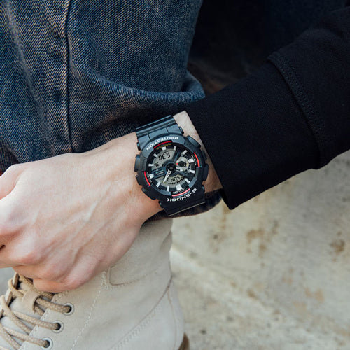 A stand-out with distinctive large case. The original color scheme is faithfully reproduced with touches of G-SHOCK red, representing the passion to take on challenges; blue, symbolizing excellent water resistance; and yellow, signifying outstanding shock resistance.