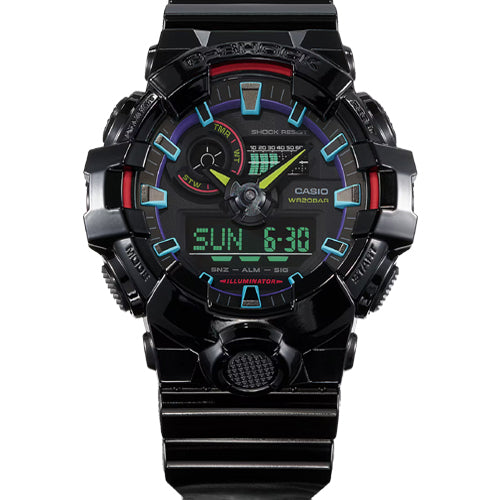 Venture into the Virtual Rainbow lineup — explore the colorful spectrum that emerges when the cybertech game-world aesthetic meets the G-SHOCK quest for the ultimate toughness.The bezels and bands bring in glossy black, while the faces feature rainbow vapor deposition and multicolored designs. The result is a range of bold looks in prisms of cool color lighting up the darkness, which crushes in any fashion scene.