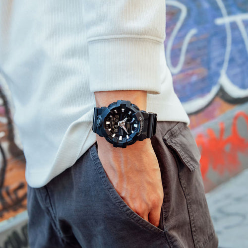 An analog-digital combination model with a front button, the iconic face of G-SHOCK symbolizing toughness, placed at the 6 o'clock position. Finished with dynamic styling that is both advanced and edgy. Improves readability using bold hands that are thick and powerful like carved metal, created using proprietary resin molding technology for the three-dimensional hour and minute hands. It also features a 3D face design achieved by making the dial ring and indices three dimensional to create synergy with the bold hands. Expresses toughness of spirit with the black color that symbolizes the brand concept. The super illuminator and hand shift function operated via the front button provide a high level of usability. A G-SHOCK that combines strength and a proprietary tough design with a 3D face.