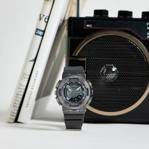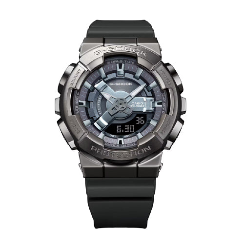 Go metal-clad in total comfort — with the popular GM-110 analog-digital combination G-SHOCK, now in an even slimmer, more compact construction. The striking depth and dimension of the dial is crafted with a multilayered arrangement of finely detailed 3D components. Paired with a design that strikes just the right balance between the digital display and analog hour and minute hands, the watch face delivers high visibility and an easy read.Dial components in metallic colors complement the stainless steel bezel cover for a look of elegantly cool styling. And the flat band design adds a distinctive touch for a statement that is extra bold.