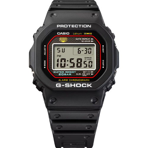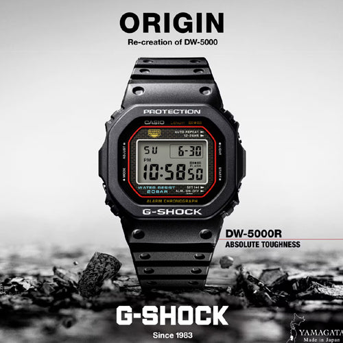 G-SHOCK marks yet another milestone! Celebrate with a return to the brand’s original game-changing vision, now 40 years later and updated with today’s cutting-edge technologies. In true G-SHOCK style, the DW-5000R stays true to G-SHOCK origins and yet forges ahead with innovation at the same time. Inheriting the design concepts of the first-ever G-SHOCK, this updated take on the original incorporates current state-of-the-art Casio technologies to deliver today’s advanced functionality in a supremely faithful re-creation of the original iconic design. Just like the first, the case is made of stainless steel, and the original band design, too, is reproduced down to the smallest detail — length, form, and even the position of the dimples. The case size has been updated to 42.3 mm from the original 41.6 mm. In a further nod to where G-SHOCK began and how far it has come, the bezel and band are, like the original, made with resin, but now bio-based. This material is expected to help reduce environmental impact.