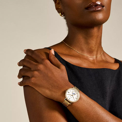 This 36mm Jacqueline features a white mother-of-pearl satin and textured dial, sun moon multifunction movement and gold-tone stainless steel bracelet.