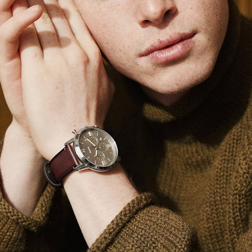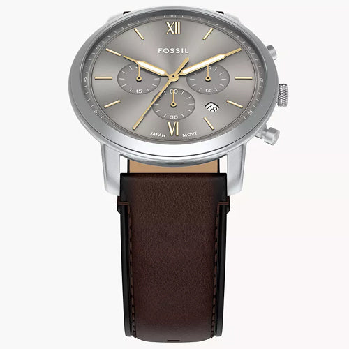 Meet Neutra, our mid-century-inspired chronograph. Sleek and minimalist, with a grey sunray dial and rich brown leather strap. Classic styling, yes, but with modern functionality—a 44 mm rose gold-tone stainless steel case houses precise quartz chronograph movement. Timeless, yet of-the-moment. Fossil leather products support responsible manufacturing via the Leather Working Group.