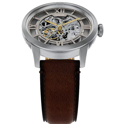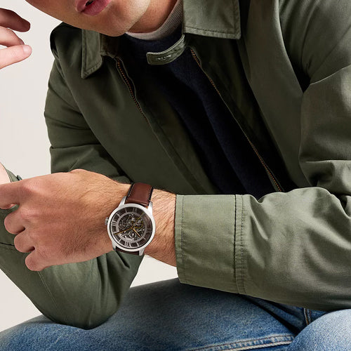 The Townsman watch is a modern icon, crafted to showcase the intricate automatic movement. The self-winding mechanism is exposed through a rich grey sunray skeleton dial delivering an uncompromising view of the inner workings. Created for precise timekeeping, it features a supple brown leather strap that offers a sleek and refined look. It's a true standout for effortless, everyday style.