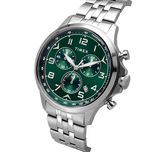 Look stylish and elegant by wearing this men's analog watch by Timex. Its stainless steel strap showcases a silver hue that uplifts the look of the watch. The green round dial is nestled in a 47.7 mm case and is secured by a mineral glass. It exudes chronograph. Furthermore, it is completed with a deployment clasp to ensure a secure fit on the wrist.