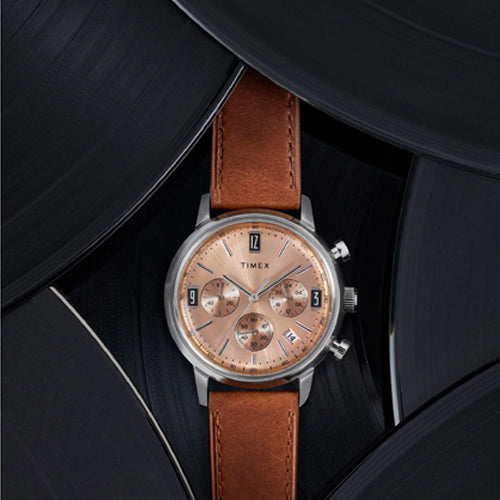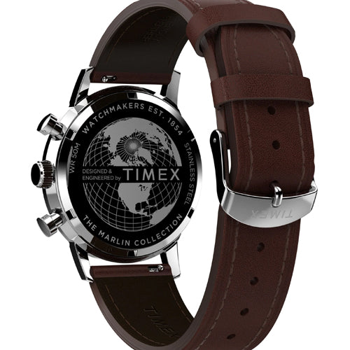 Our Marlin Chronograph Tachymeter boasts the distinction of being the first chronograph in our Marlin line, as well as the first Marlin powered by a quartz movement. This beautifully detailed rendition features a tachymeter index along its outer minute track to measure speed, as well as a unique date window placement. We’ve paired it with a supple brown natural leather strap, sourced from the Leather Working Group® (LWG) and complete with quick-release spring bars. Though its build breaks new ground in our watchmaking heritage, this timepiece retains the classic Marlin features with a sturdy 40mm stainless-steel case, domed acrylic crystal lens, and retro-style applied indices at 3, 9, and 12 o'clock.
