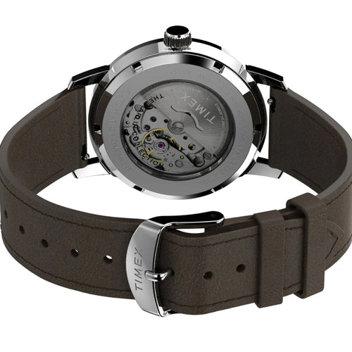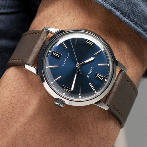 Ticking inside this iteration of our iconic 1960s Marlin® is a tried-and-true 21-jewel automatic movement, creating a contemporary timepiece that honors our watchmaking history. Powered by your motion as you wear the watch, the movement can store a maximum 40 hours of energy. If motionless longer than 40 hours, wind the watch using the crown until you feel resistance, set the time, and place it back on your wrist where every motion will supply the energy. True to our original Marlin design, this watch features the iconic domed acrylic crystal, complemented by a stainless-steel case, navy dial, and classic brown leather strap sourced from the S.B. Foot Tanning Company.