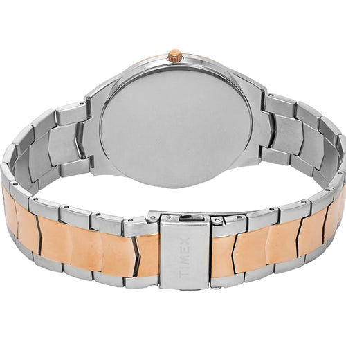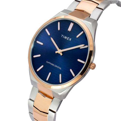 A perfect amalgamation of style and functionality, this men's analog watch by Timex is a must-have wrist essential. Its stainless steel strap comes in a silver & rose gold hue that elevates the look of the watch. Safeguarded by a sapphire and operated by a quartz movement, the blue round dial is encompassed in a 41 mm case. It features plain two hands. Furthermore, it is complemented with a push-button clasp that ensures a secure fit on the wrist.
