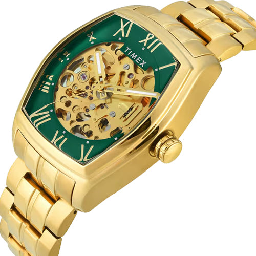 Make a statement with the Timex TWEG25904, a distinguished automatic watch designed for men who value style and substance. Featuring a striking green tonneau-shaped dial, this timepiece combines classic craftsmanship with a contemporary edge. Encased in durable stainless steel, the watch boasts an automatic movement that winds with your every motion, delivering seamless, battery-free precision. Perfectly balancing bold aesthetics and reliable functionality, the TWEG25904 is ideal for both everyday wear and special occasions.