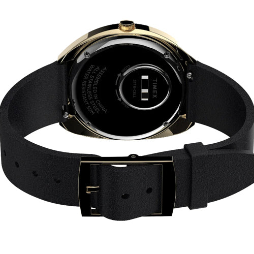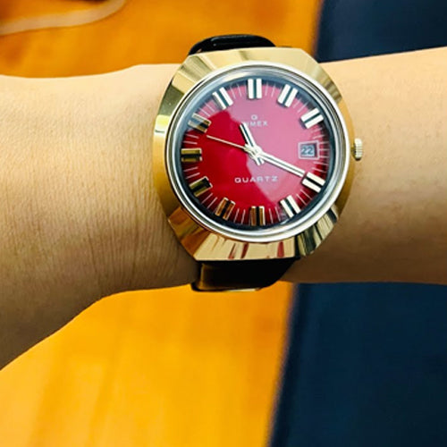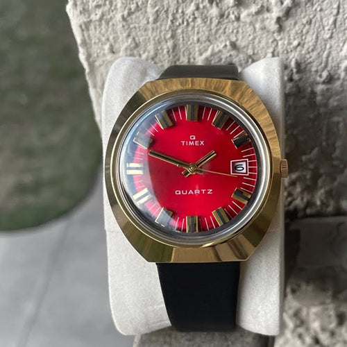 Q SST Gold tone Case Burgundy Dial Black Leather Strap Case measures 43mm long and 39mm wide. We’ve deeply proud to bring you this 1972 blast from the past, expanding our Q Timex Reissue story. This archival quartz watch delivers boldness from every angle, boasting a gold-tone tonneau case profile, 43mm long and 39mm wide, with all-around polished finishing. you’ll also find our usual attention to detail with dimensional floating hour markers that hover above the striking red dial and a polished handset to match, plus a period-perfect domed acrylic crystal on top. As for your story and the new watch you're sporting, we say sit back and let the record play on for a little while. We’ll catch you on the flip side.