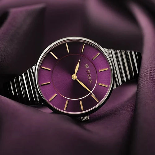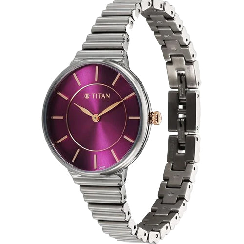 Titan Aura Quartz Analog Purple Dial Stainless Steel Strap Watch for Women 34mm 95245KM01