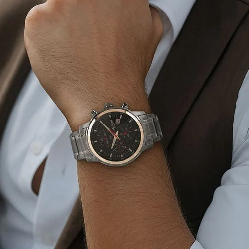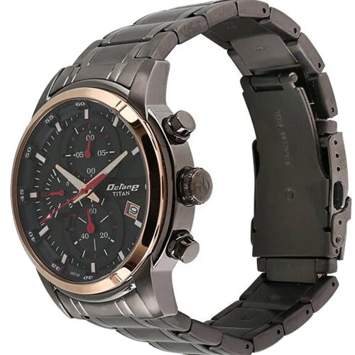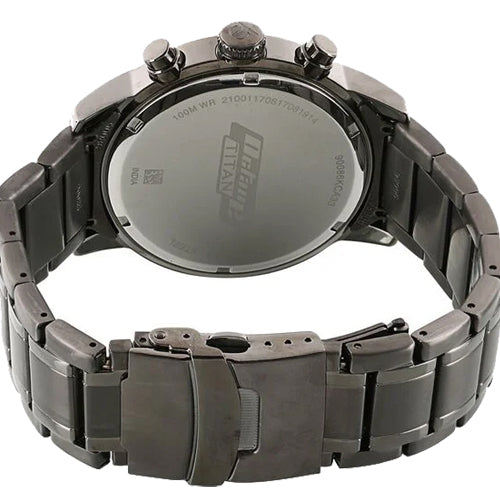 This black dial chronograph watch from Titan's Octane collection is classy and boldly distinctive. Powerful, sturdy and precise, with its mineral glass cover, stainless steel strap and 10 ATM water resistance, this timepiece exudes raw power. The golden hands and digits pair with a vibrant red seconds hand to contrast vibrantly against the dark background for that dominatingly masculine look. The watch comes with a rotating bezel and a 1/10 chronograph with date. Its elegant appearance, 24 month warranty and extremely secure diver's clasp all point to the immense value and distinction for its owner.
