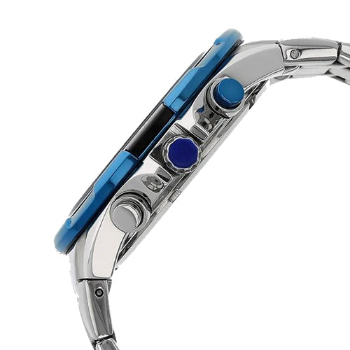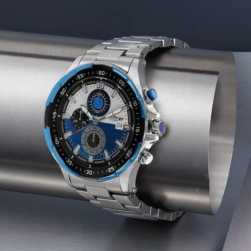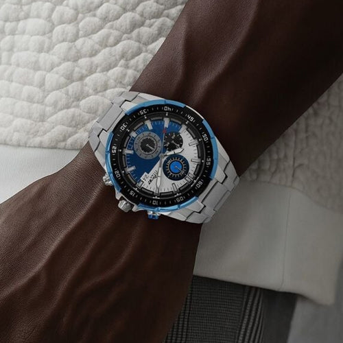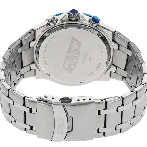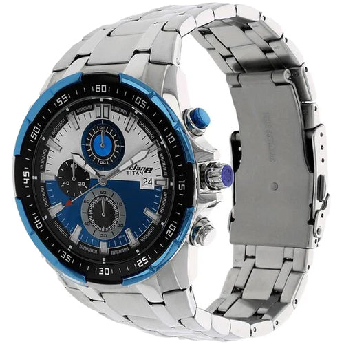 This chronograph watch for men features a silver and blue, round dial. A crown is fitted to let you adjust the time. Consisting of three subdials, the dial also features plain three hands, along with Fastrack Tick markings and a date indicator. The bezel showcases Arabic numeral indicators and Fastrack Tick markings. Its strap, made of stainless steel is silver in colour. A pusher is present. Equipped with 10 ATM water-resistant feature, this watch is user-friendly. It comes with a 24 month warranty.