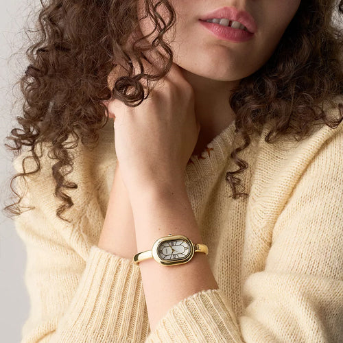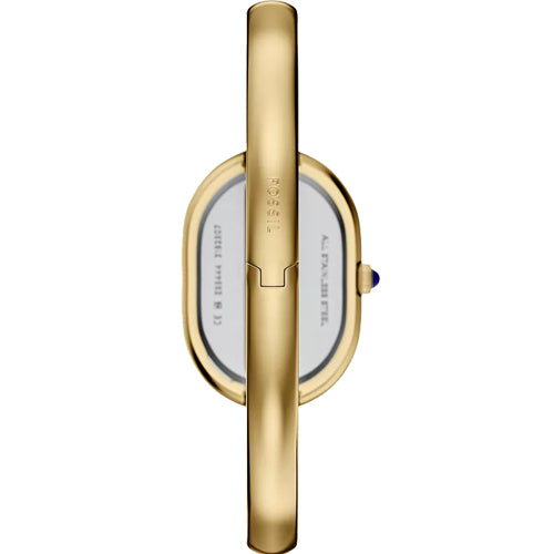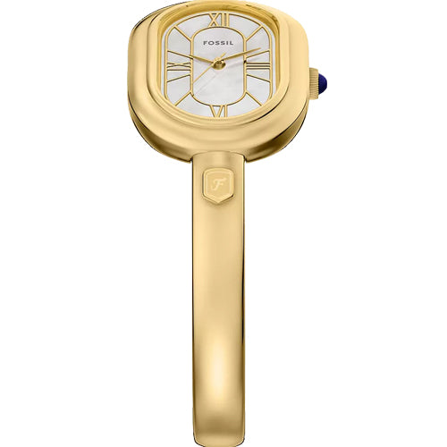 The gold-tone stainless steel jewellery-inspired bangle bracelet pairs seamlessly with the oval case to create a sleek and sophisticated bangle watch. The shiny mother-of-pearl dial, accented with gold-tone hands and indices, enhances the watch's radiant elegance and cohesive design. The bangle bracelet features a convenient push-button closure engraved with the Fossil shield logo, allowing for easy wear and removal.