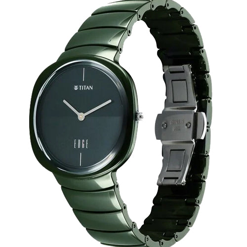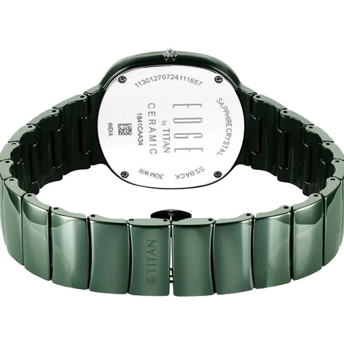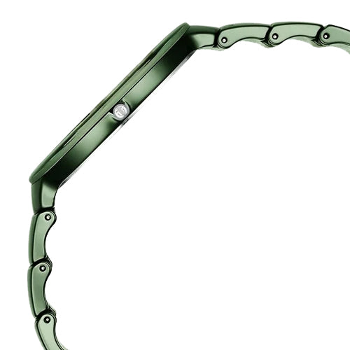 This timepiece is part of the Camo collection which is inspired by the dual nature of camouflage which conceals and accentuates as per the whims and necessities. These watches blend into the personal style while also making the wearer stand out. This watch is powered by the T9081 in-house caliber movement ensuring reliable timekeeping and is crafted out of high grade ceramic. The slim profile of 4.4mm makes it perfect for all occassions where the intented look is effortless sophistication. This watch is in a deep hunter green colour. The strap is made out of curved ceramic links which sit perfectly on the wrist. The dial with a dual hemisphere finish is protected by the sapphire crystal which has tangible ripple serrations. The hands are in silver to ensure visibility and a minimalistic look. This watch is resistant upto 3 ATM. A perfect addition to any wardrobe, this watch can be worn for almost any occassion because it is just the perfect accessory for any look.