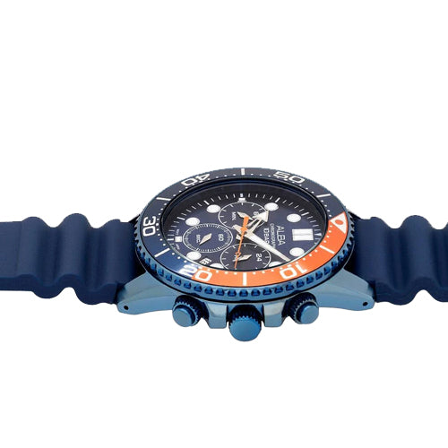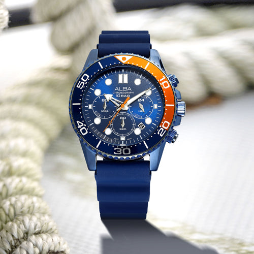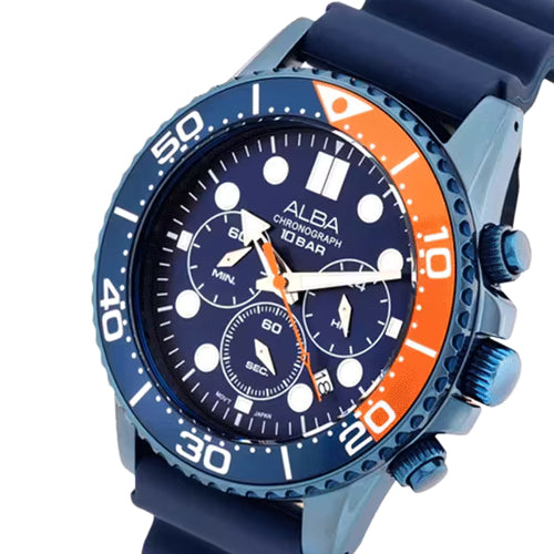 Make a bold statement with the ALBA AT3J45X1 — a chronograph watch that fuses vibrant design with precision performance. Its striking cobalt blue dial is complemented by a dynamic blue and orange bezel, creating a sporty yet refined aesthetic. Engineered with a durable stainless steel case and powered by reliable quartz movement, this timepiece doesn’t just keep time — it keeps up with your pace. Luminous hands and markers ensure visibility day or night, while the chronograph functionality adds practical versatility. Perfect for the man who values both style and substance.
